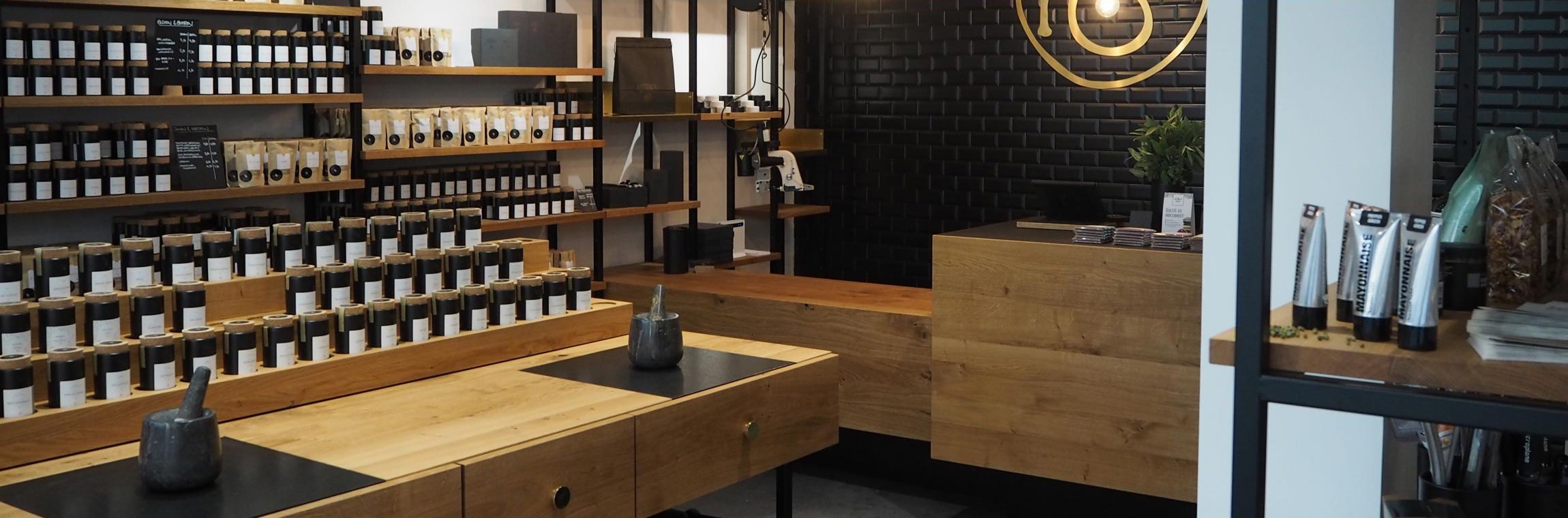 Eine Marke, gegossen in ein Ladenlokal. Massives, geöltes Eichenholz, Messing und schwarze Stahlrahmen erschaffen einen modernen und gleichzeitig handwerklichen Rahmen, passend zu Pfeffersack & Soehne.